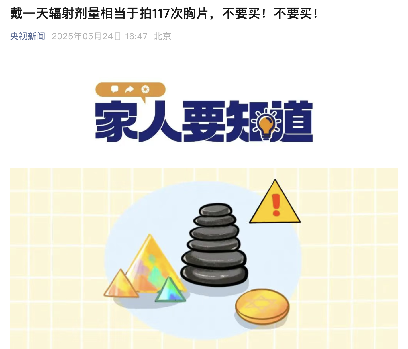 近日,央视新闻曝光的“辐射保健石”事件令人触目惊心。辐射量超标1050倍,戴一天≈拍117次胸片,这类“伪珠宝”揭开了有害首饰的“健康陷阱”。